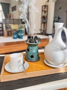 “The smoke from the incense reminds me of Akai’s message about taking three intentional breaths: releasing tension, acknowledging feelings, and choosing how to respond. The way I arrange the coffee service reflects Dr. Makinde’s advice to eat mindfully and slow down. Taking time for this quiet ritual also aligns with Genna and Lelah’s guidance on finding what truly energizes us rather than what drains us.”