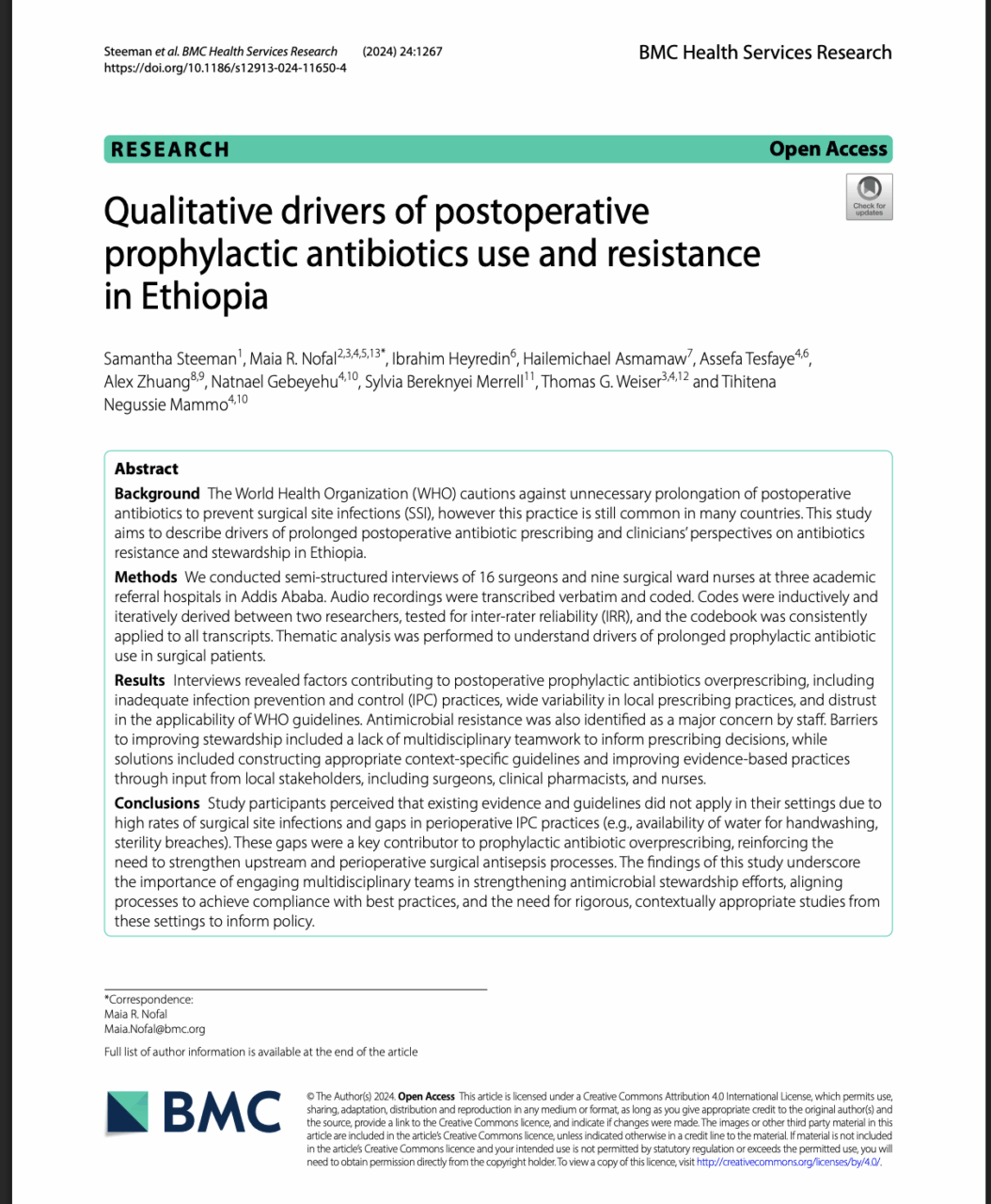 This study aims to describe drivers of prolonged postoperative antibiotic prescribing and clinicians’ perspectives on antibiotics resistance and stewardship in Ethiopia.